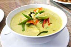 - Ingwer und Knoblauch schälen. Beides sehr fein hacken. Öl in einem großen Topf erhitzen und die Hähnchenfiletstücke darin scharf anbraten, bis die Sojasoße verdunstet ist. Ingwer und Knoblauch hinzufügen und kurz mit anbraten. Anschließend mit der Gemüsebrühe und Kokosmilch ablöschen. Für etwa 10 Minuten köcheln lassen.