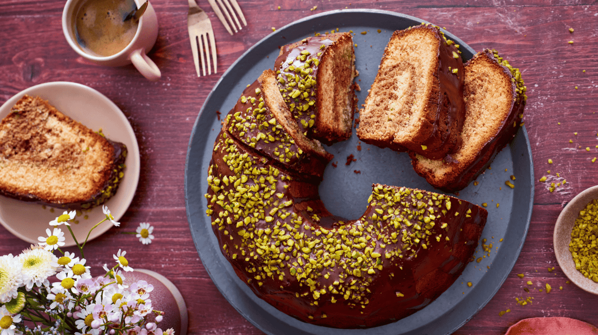 Rezept für einen saftigen Gugelhupf mit Nougat und Pistazien