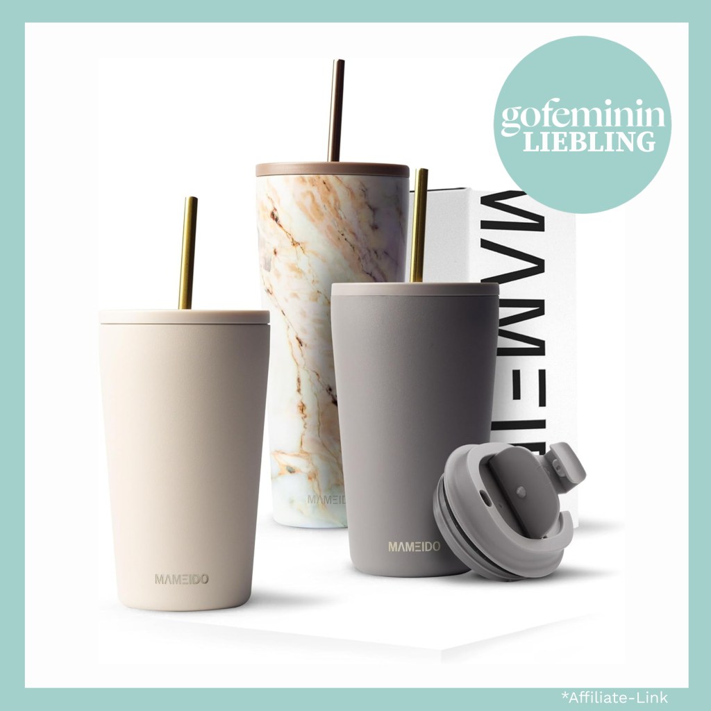 Eine tolle Option sind zum Beispiel die auslaufsicheren und doppelwandig isolierten Thermobecher von MAMEIDO*. Richtig cool: Die Becher kommen automatisch mit 2 auslaufsicheren Deckeln, einer typischen Flip-Öffnung und einer Variante mit Strohhalm.
