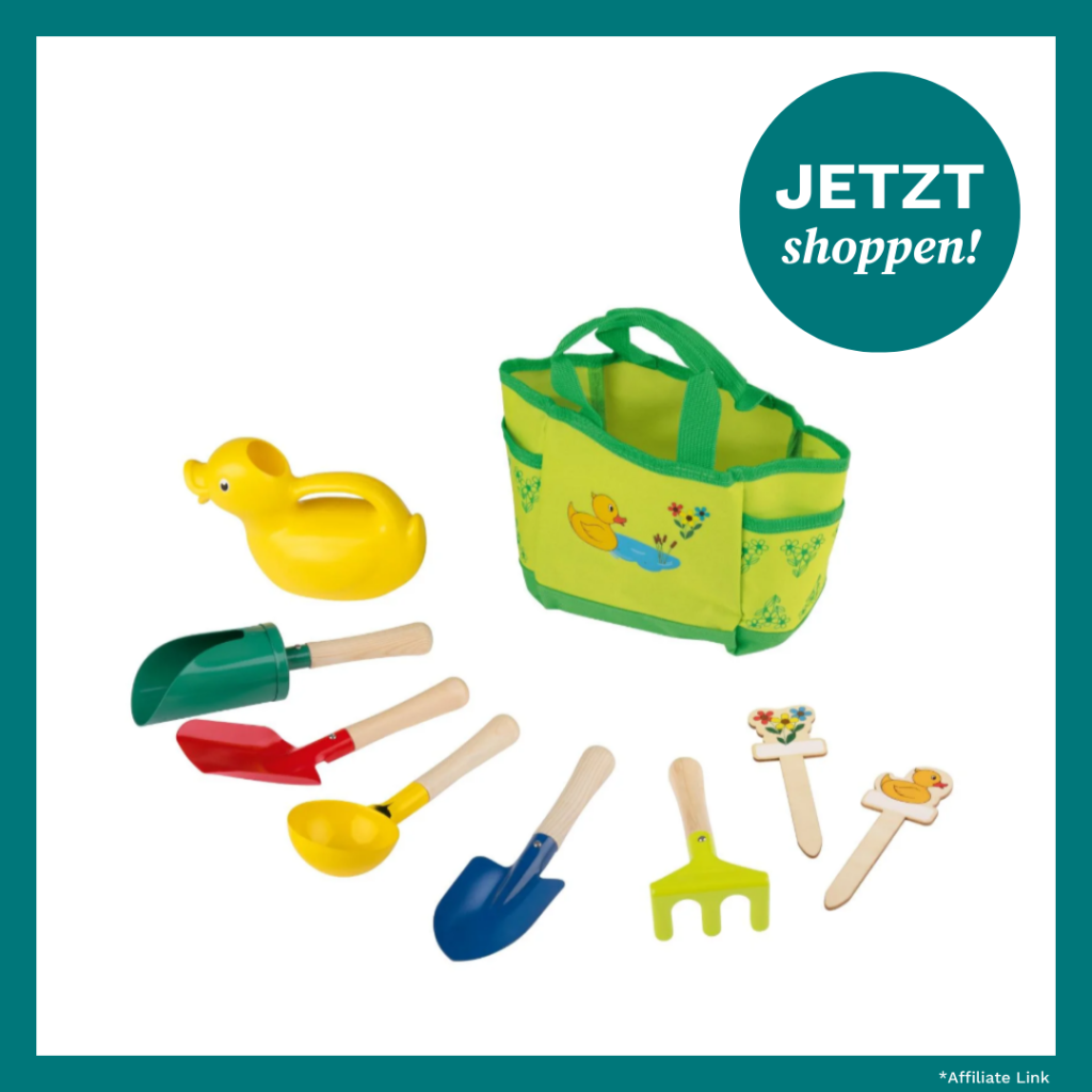 Leider sind die spitzen Hacken und schweren Schubkarren gar nichts für kleine Kinderhände. Viel zu gefährlich und unhandlich. Zum Glück bietet Lidl momentan ein süßes Garten-Set* für Kinder an, mit dem die Kleinsten euch bei der Gartenarbeit sicher unterstützen können.