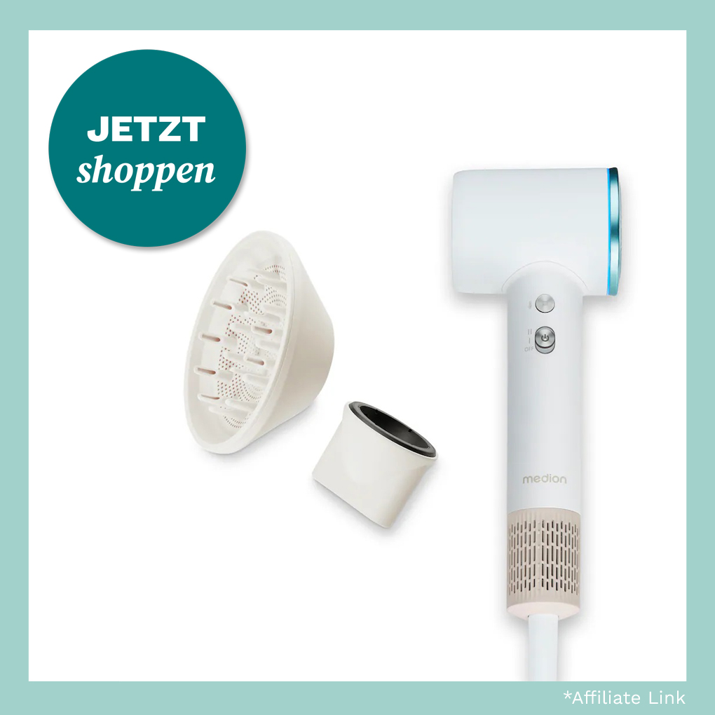 Ein Föhn, der deine Haare richtig schnell trocken pustet, gibt es zum Beispiel von Medion*. Das Modell „Life HD 1“ sieht nicht nur super stylisch aus, ist kompakt und leicht, sondern hat mit seinen 1.600 Watt auch richtig Power – bleibt dabei aber angenehm leise.
