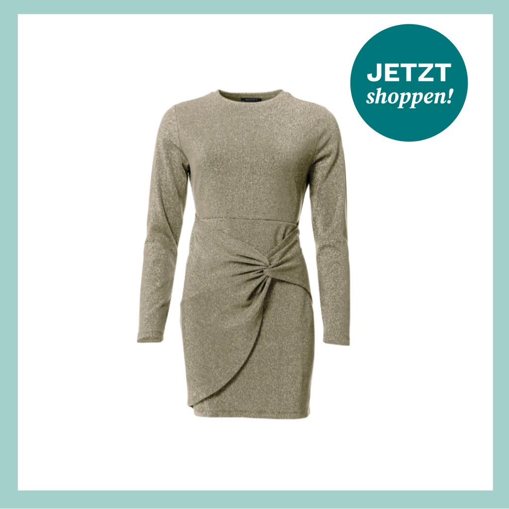 Der dekorative Knoten im Bauchbereich sorgt für einen lockeren drapierten Effekt, sodass sogar von einem kleinen Bauch abgelenkt wird. Ihr könnt an den Weihnachtstagen also gerne etwas mehr essen. Ein kleines Food-Baby macht dem Glitzer-Kleid* von Lidl nichts aus.