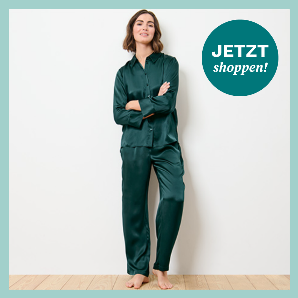 Auf der Suche nach einem passenden Zweiteiler bin ich bei Tchibo fündig geworden. Ich muss zugeben, in den Seidenpyjama* in Smaragdgrün habe ich mich direkt verliebt. Da es sich um echte Seide handelt, ist das Modell zwar etwas teurer, aber das darf man sich auch mal gönnen.