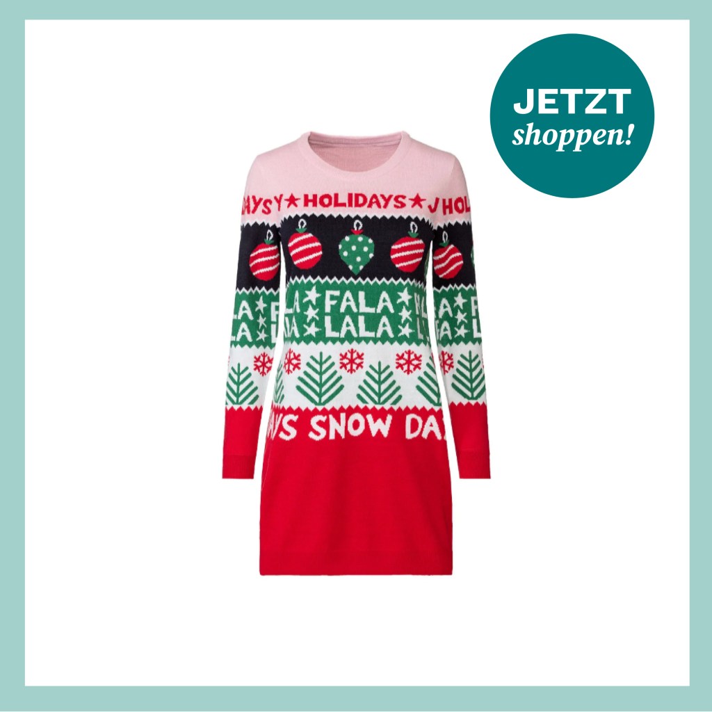 Steht ihr nicht so auf Pullis, sondern tragt ihr lieber Kleider? Auch das ist kein Problem. Denn zum Glück bietet der Discounter Lidl einige Ugly Christmas Dresses* an. Die Kleider sind an Weihnachten ein echter Hingucker, denn es gibt sie in drei unterschiedlichen Designs: mit weihnachtlichem Schriftzug und Christbaumkugeln, ein klassisches Lebkuchen-Design oder mit einem süßen Rentier-Emblem.