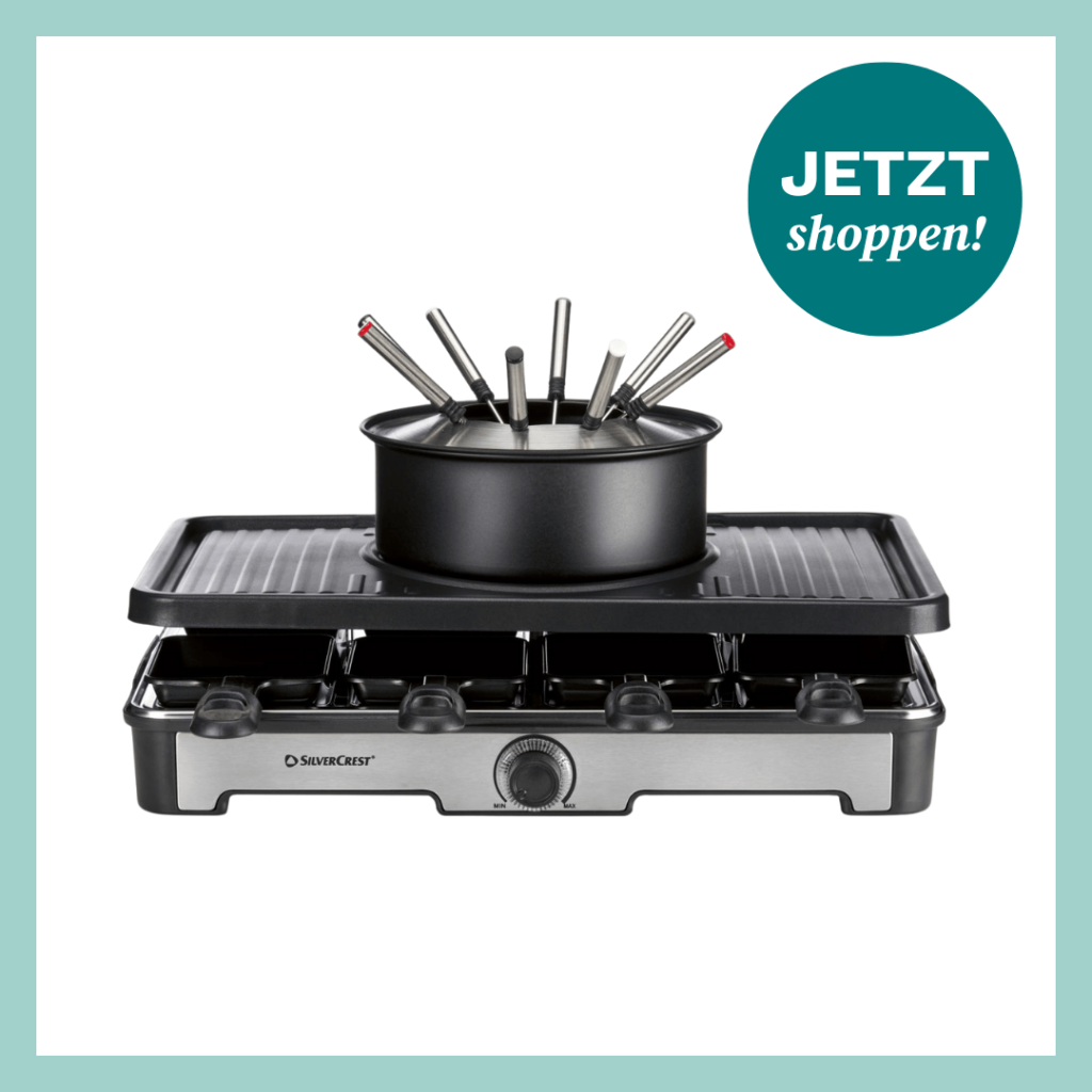 Wenn ihr sowieso etwas mehr Geld für ein Raclette in die Hand nehmen wollt, dann könnt ihr stattdessen auch gleich die Premium-Fondue-Raclette-Kombination von Lidl* für 49,99 Euro kaufen.